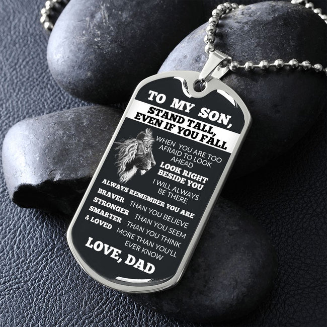 Are You Looking for the Perfect Gift for Your Son? Whether it's his Birthday, Graduation, Christmas, or another special occasion, this dog tag necklace is sure to be a heartfelt gift. You can even customize it further by having a special message engraved on the back of the dog tag. Purchase this BEST SELLER and we guarantee it will exceed your highest expectations!
